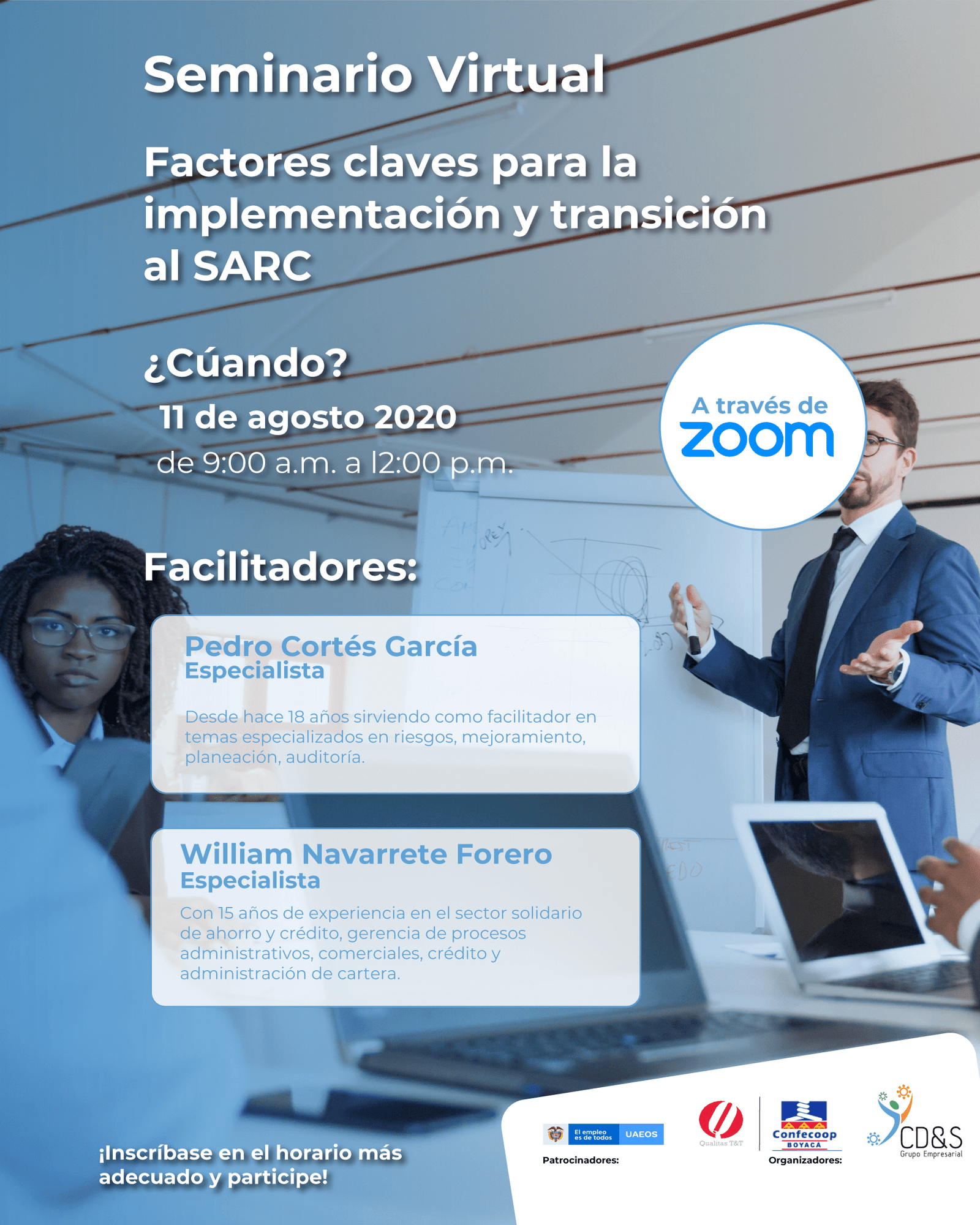 En Alianza con Confecoop Boyacá y Grupo CD&S el pasado 11 de Agosto se realizó el primer seminario virtual con más de 130 asistentes donde se dio a conocer acerca de las estrategias y métodos sobre la implementación del Sistema de Administración de Riesgo Crediticio